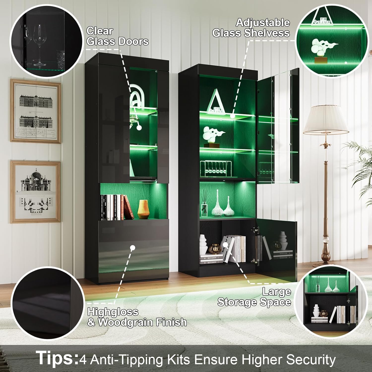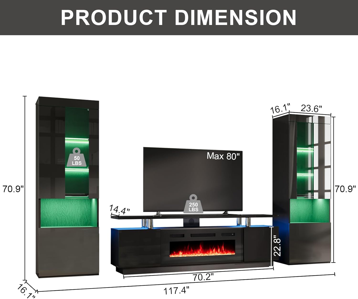 Includes 70" 2-Tier Fireplace TV Stand with 36" Fireplace, 2 x Modern High Gloss Bookshelves with LED Lights & Glass Doors, Black