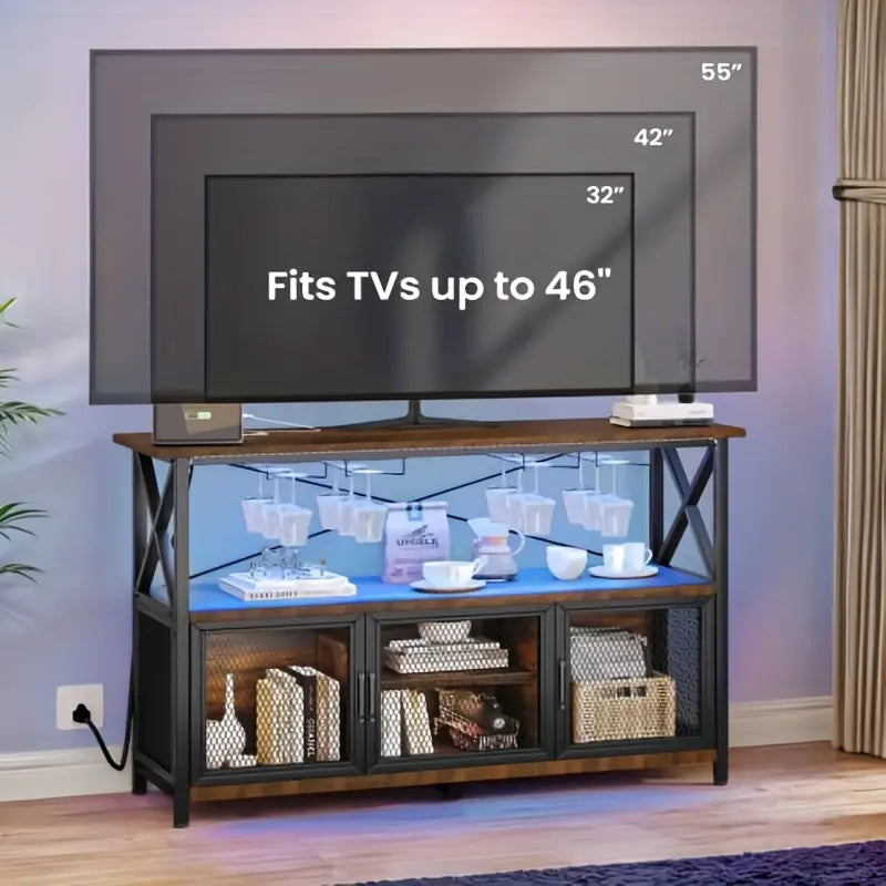 Wine Cabinet with LED Lights, Bar Cabinet with Power Outlet, Bar Table Stand with Wine & Glasses Rack, Storage Cabinets, Adjustable Shelf, Rustic Brown